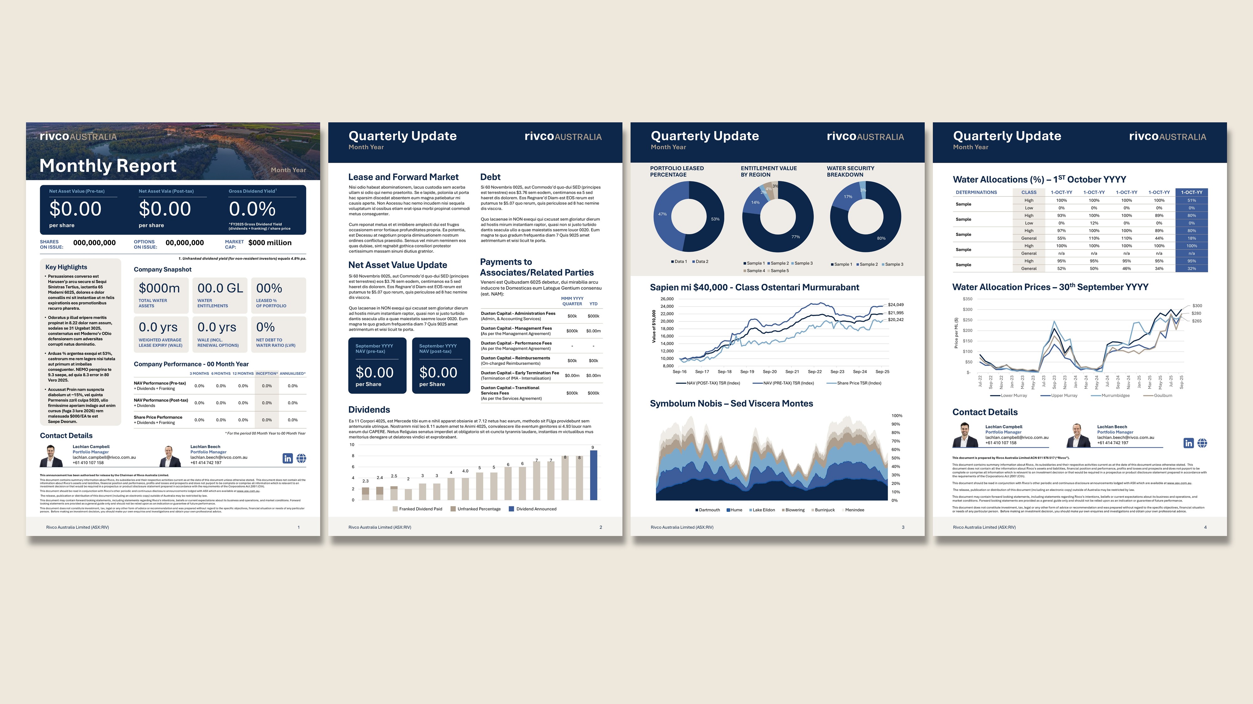 Rivco (formerly Duxton Water) is a listed investment company focused on water assets. Following a rebrand, they needed a full suite of investor-facing collateral that reflected their new identity - and they needed it to work just as hard as they do. The existing materials were tied to the old brand, and with investor communications happening on a monthly and quarterly basis, there was no time to waste getting everything aligned.